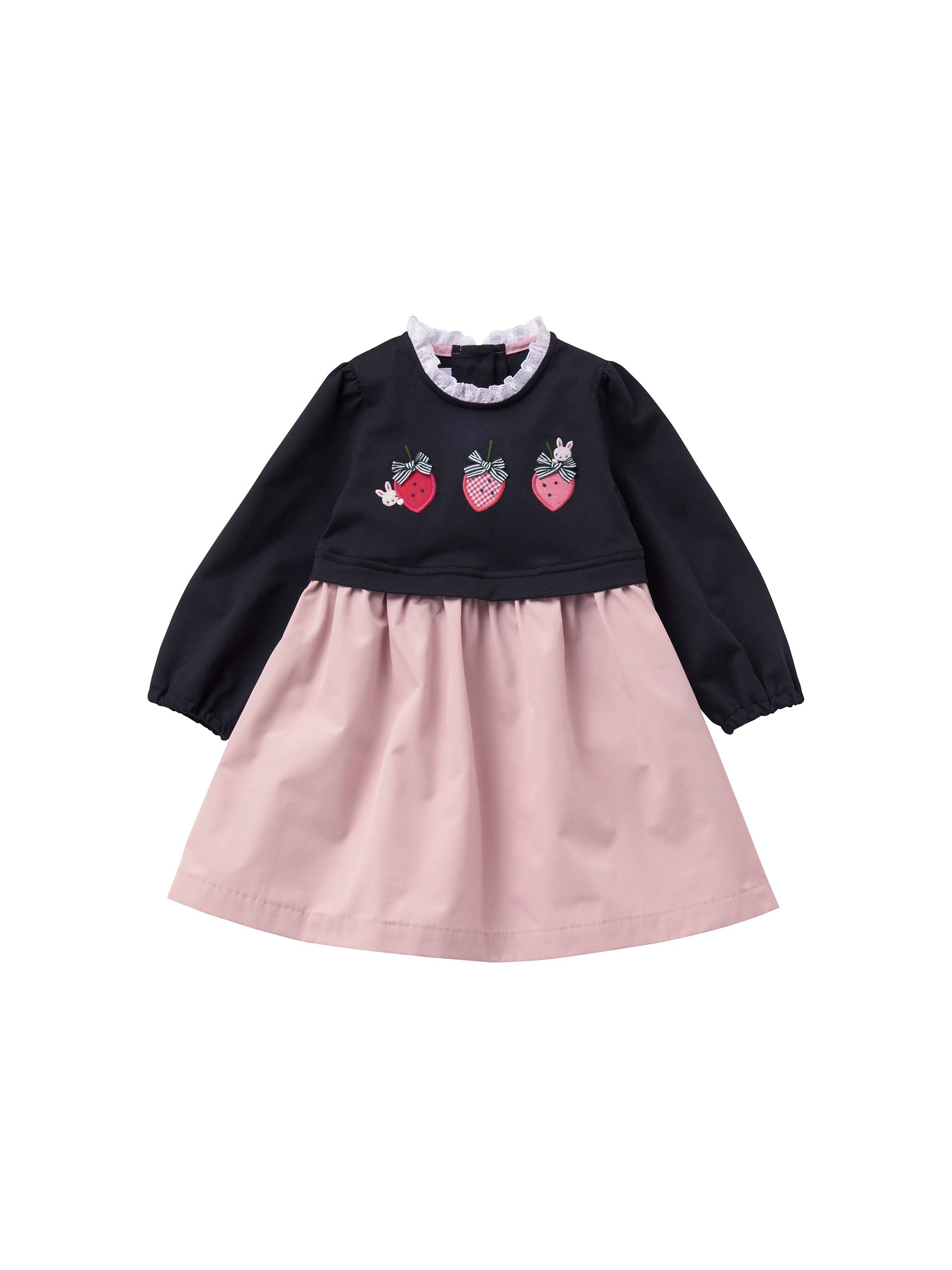 3つのイチゴとうさちゃんがとっても可愛らしいワンピース。襟ぐりのホワイトレースが上品で、小さなお嬢様を演出できます。ドレッシーながらも、かわいい見た目にママも大満足!