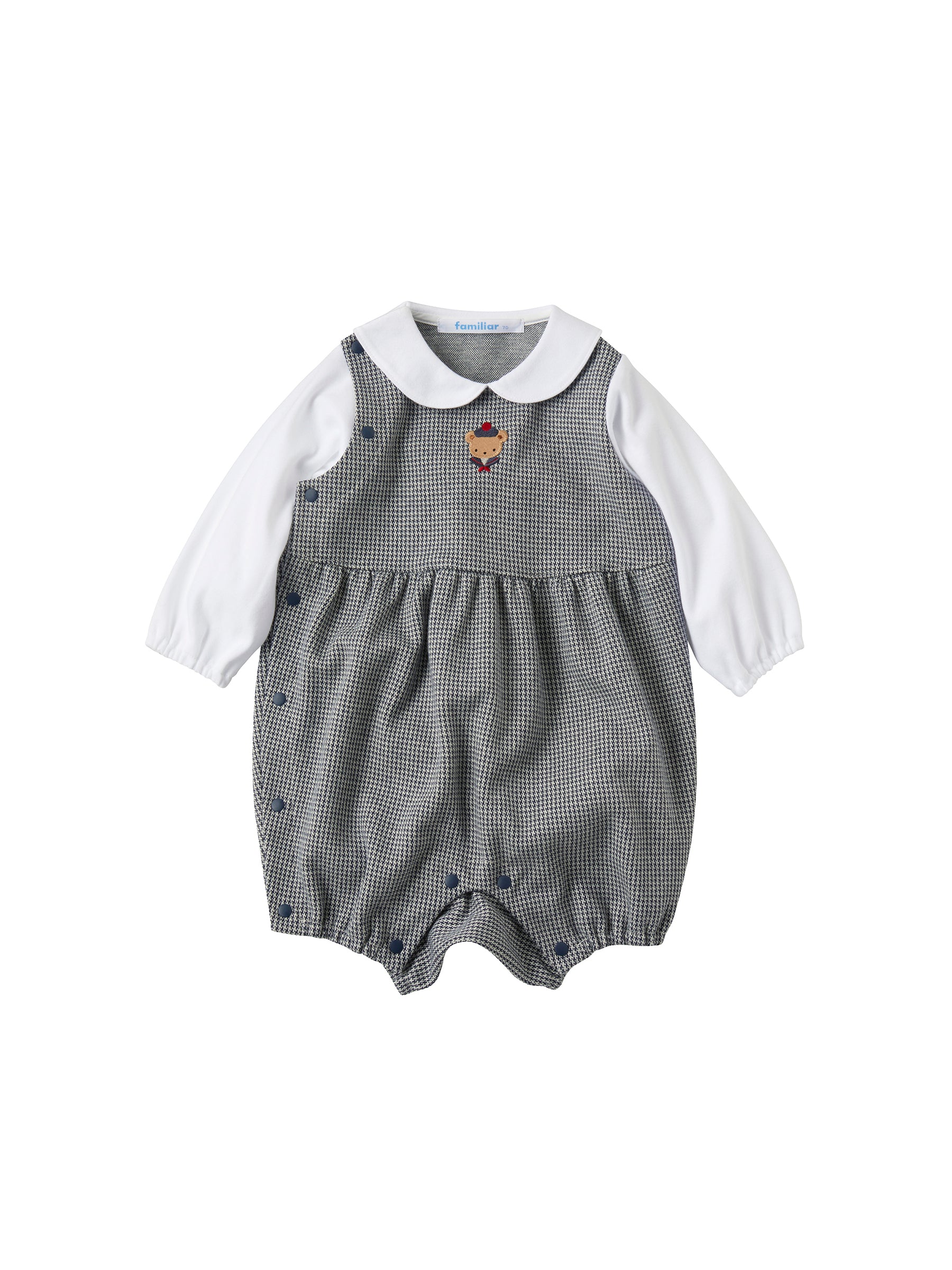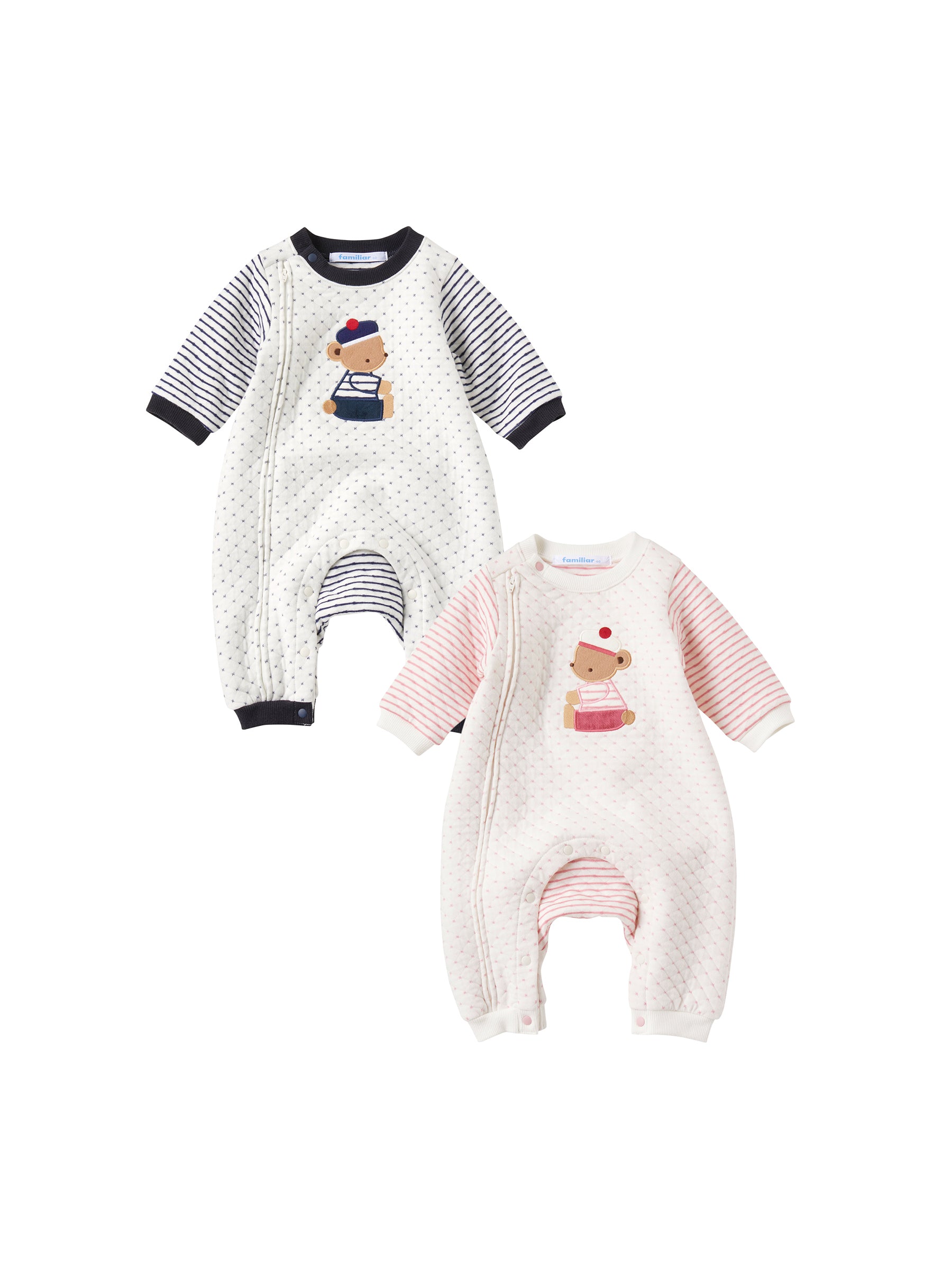 ボーダーとドットのリバーシブルキルトを使用した、オシャレなデザインのカバーオール。ソフトでふんわりとした極上の肌触りや、くまさんのワッペンがとてもファミリアらしい一品です。