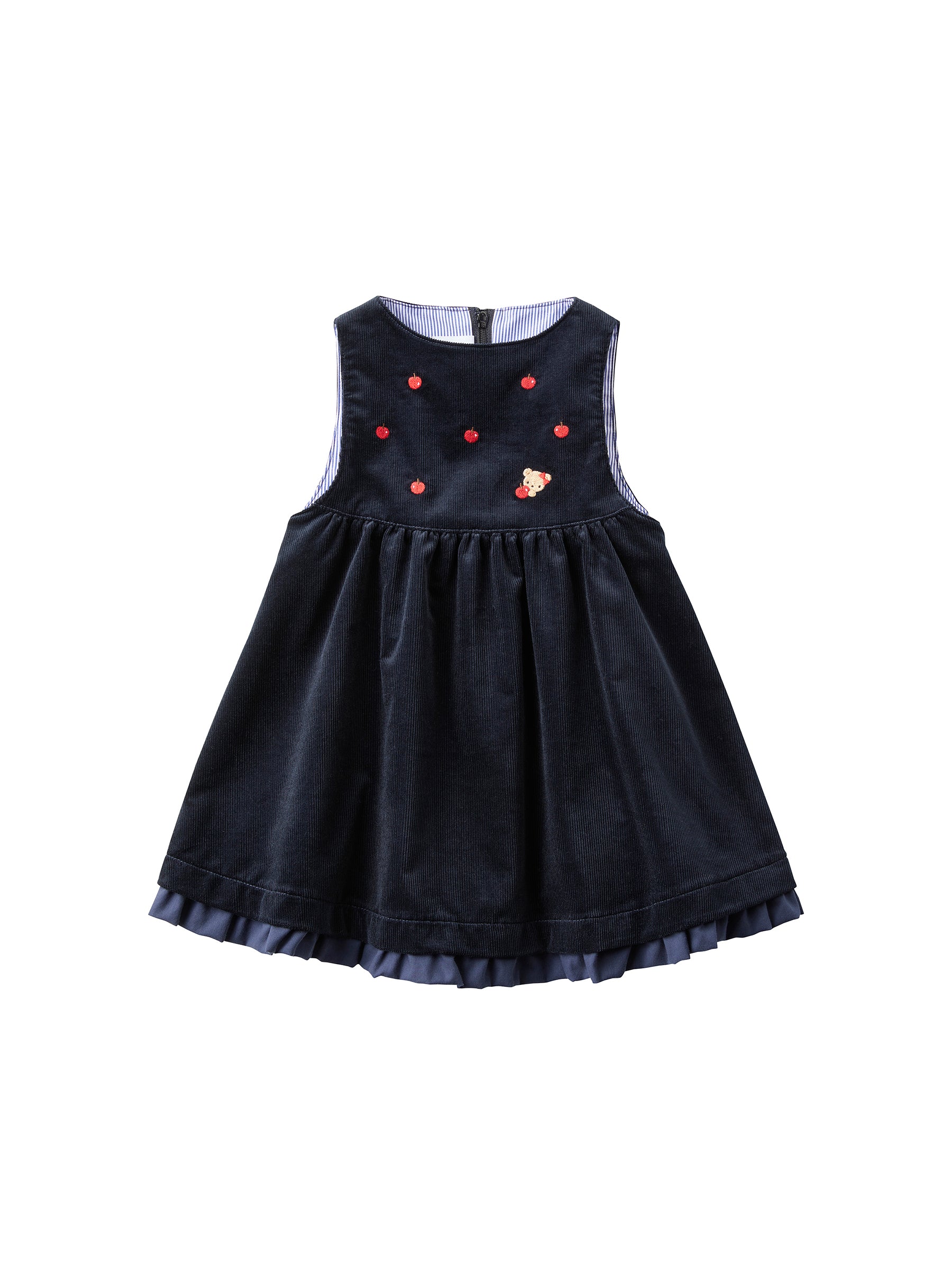 ネイビーのコーデュロイ素材がおしゃれなジャンパースカート。軽量の特殊なポリエステル素材で柔らかく、上品なお嬢様を演出できます。シックながらも、ファミリアならではのリンゴのポイント刺繍がとってもキュート!