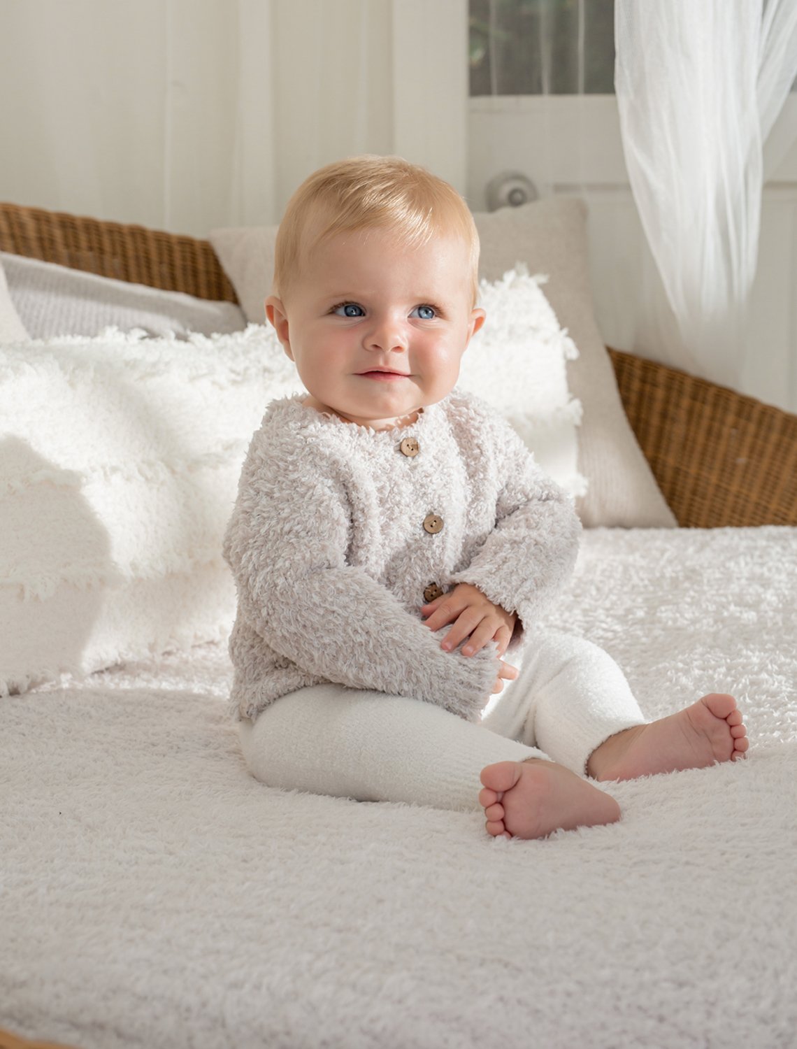 ベアフットドリームスのベビーカーディガンは、ふわふわモコモコのマイクロファイバー素材。極上の触り心地で優しく赤ちゃんを包んでくれます。ユニセックスデザインなので男の子・女の子どちらにもおすすめですよ。